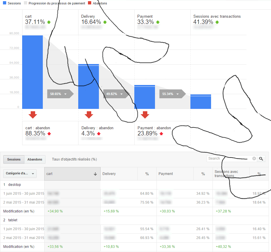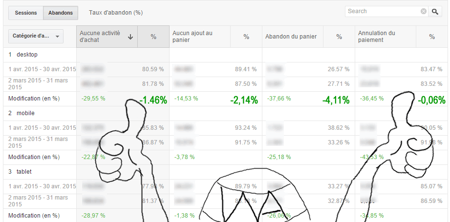 Si vous souhaitez analyser la déperdition entre les étapes, sélectionner la vue « abandon ». Afin de préciser votre analyse, je vous conseille d’utiliser la dimension « catégorie d’appareil » (l’expérience est souvent très différente entre les appareils et ne peut être confondue) et surtout comparer les taux d’abandon avec la période précédente pour savoir où vous en êtes.