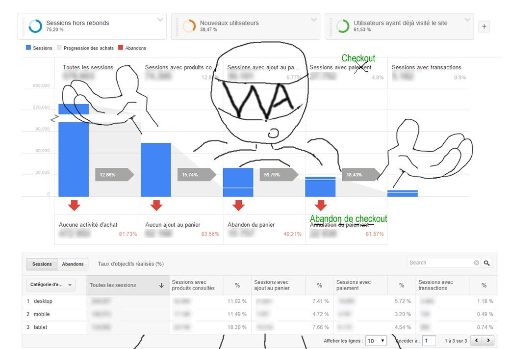 Voici une vue qui devrait vous plaire, car elle schématise l’expérience d’achat des sessions (visites) de votre site e-commerce.