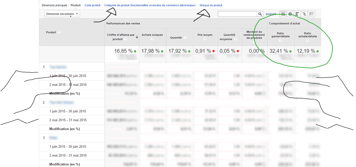 - Les ratios « produit ajouté au panier/détail produit vu » et « »produit acheté/détail produit vu ».
