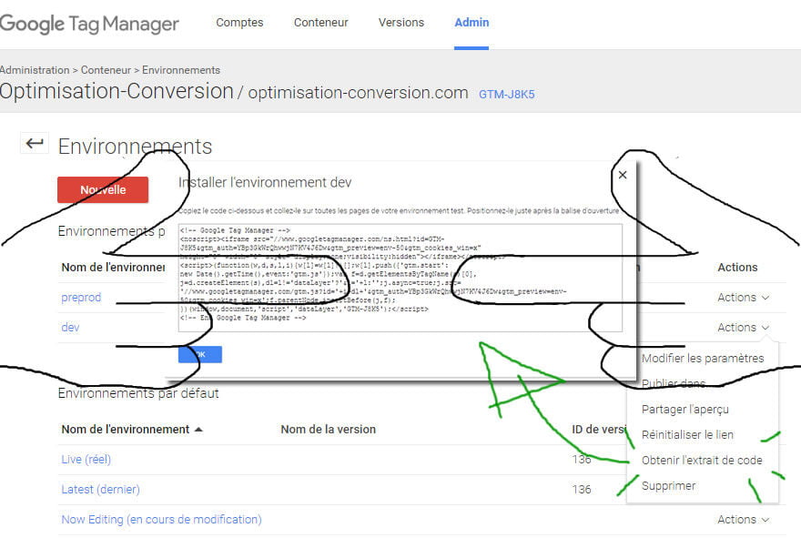Remplacez le script Google Tag Manager au lieu du code existant. Pour obtenir ce script, sélectionnez « Obtenir l’extrait de code » dans le menu « Actions » de l’environnement.