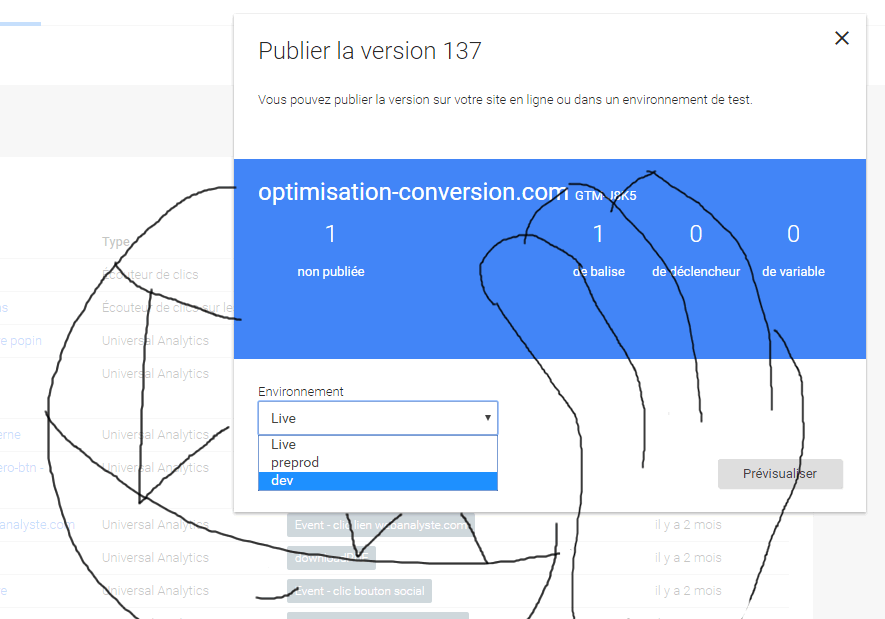 Comme nous l’avons vu, Google Tag Manager permet de publier par défaut, une version de conteneur dans le seul environnement « live ».
